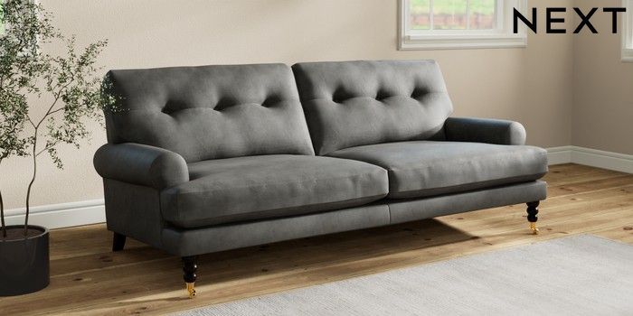 7.2.10 Erin Buttoned Back Deep Relaxed Sit 3 Seater Sofa Monza Faux Leather Easy Clean Dark Grey High Classic Turned Brass Castor - Dark | Made Click here to use our website with more accessibility support, for example screen readers