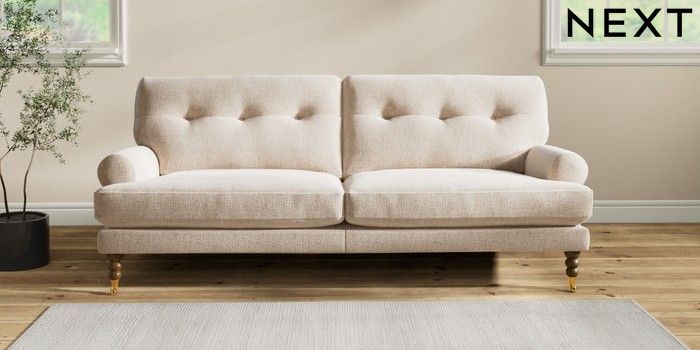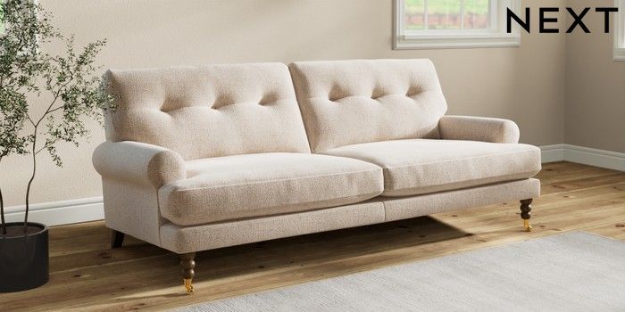 7.2.10 Erin Buttoned Back Deep Relaxed Sit 3 Seater Sofa Multi Weave Mid Natural High Classic Turned Brass Castor - Mid | Made Click here to use our website with more accessibility support, for example screen readers