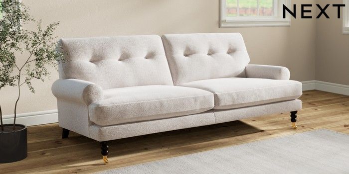 7.2.10 Erin Buttoned Back Deep Relaxed Sit 3 Seater Sofa Multi Weave Oyster High Classic Turned Brass Castor - Dark | Made Click here to use our website with more accessibility support, for example screen readers