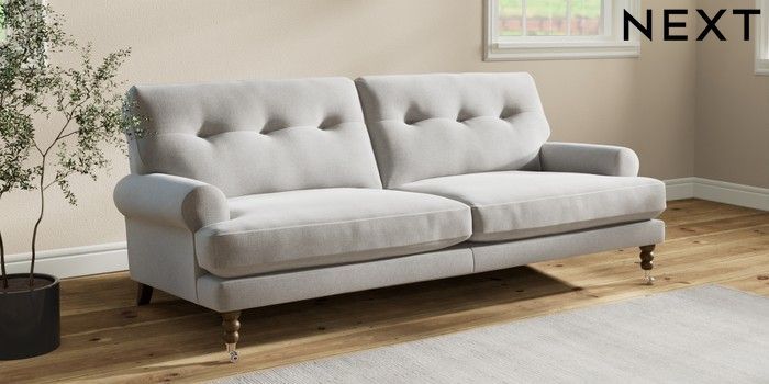 7.2.10 Erin Buttoned Back Deep Relaxed Sit 3 Seater Sofa Natural Mix Light Grey High Classic Turned Chrome Castor - Mid | Made Click here to use our website with more accessibility support, for example screen readers