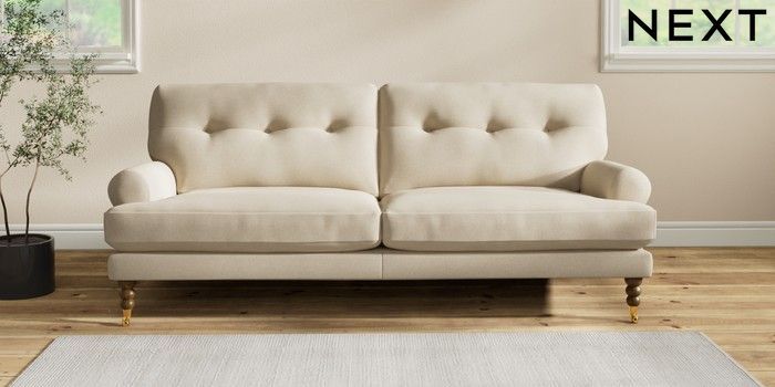 7.2.10 Erin Buttoned Back Deep Relaxed Sit 3 Seater Sofa Natural Mix Light Natural High Classic Turned Brass Castor - Mid | Made Click here to use our website with more accessibility support, for example screen readers