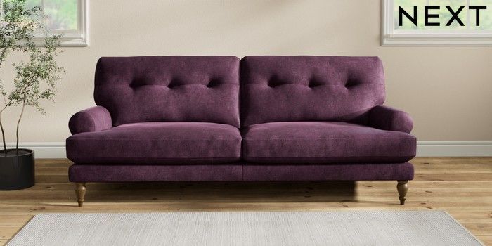 7.2.10 Erin Buttoned Back Deep Relaxed Sit 3 Seater Sofa Plush Chenille Dark Plum Purple High Classic Turned - Mid | Made Click here to use our website with more accessibility support, for example screen readers
