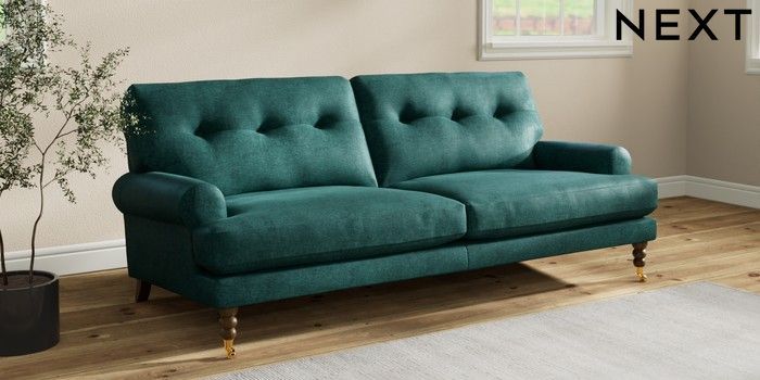 7.2.10 Erin Buttoned Back Deep Relaxed Sit 3 Seater Sofa Plush Chenille Dark Teal Green High Classic Turned Brass Castor - Mid | Made Click here to use our website with more accessibility support, for example screen readers