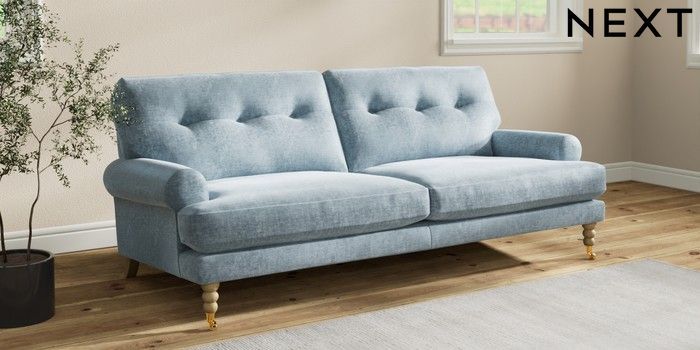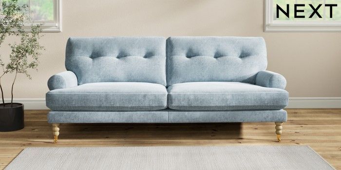 7.2.10 Erin Buttoned Back Deep Relaxed Sit 3 Seater Sofa Plush Chenille Light Blue High Classic Turned Brass Castor - Light | Made Click here to use our website with more accessibility support, for example screen readers