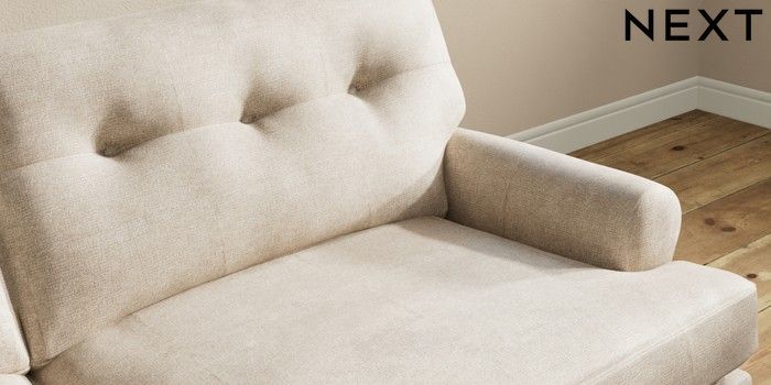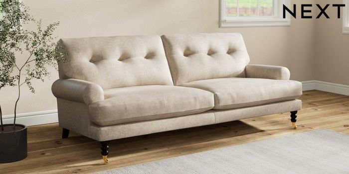7.2.10 Erin Buttoned Back Deep Relaxed Sit 3 Seater Sofa Plush Chenille Light Natural High Classic Turned Brass Castor - Dark | Made Click here to use our website with more accessibility support, for example screen readers