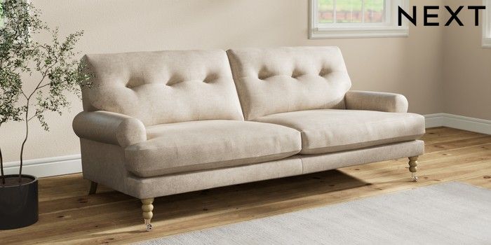 7.2.10 Erin Buttoned Back Deep Relaxed Sit 3 Seater Sofa Plush Chenille Light Natural High Classic Turned Chrome Castor - Light | Made Click here to use our website with more accessibility support, for example screen readers