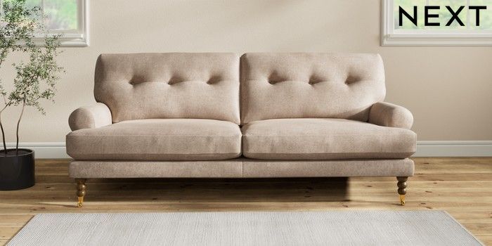 7.2.10 Erin Buttoned Back Deep Relaxed Sit 3 Seater Sofa Plush Chenille Mid Natural High Classic Turned Brass Castor - Mid | Made Click here to use our website with more accessibility support, for example screen readers