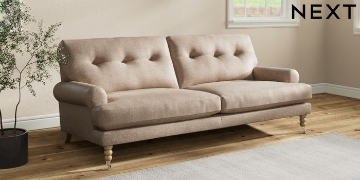 7.2.10 Erin Buttoned Back Deep Relaxed Sit 3 Seater Sofa Plush Chenille Mid Natural High Classic Turned Chrome Castor - Light | Made Click here to use our website with more accessibility support, for example screen readers
