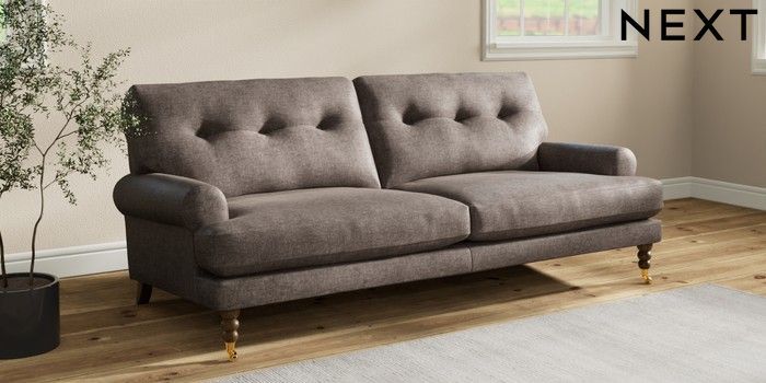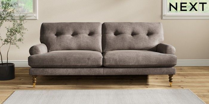 7.2.10 Erin Buttoned Back Deep Relaxed Sit 3 Seater Sofa Plush Chenille Mink Brown High Classic Turned Brass Castor - Mid | Made Click here to use our website with more accessibility support, for example screen readers