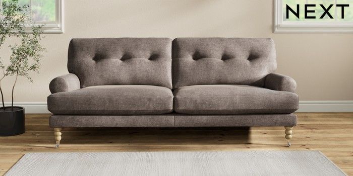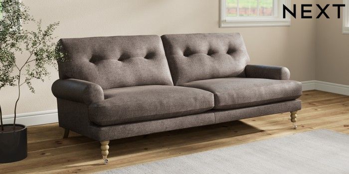 7.2.10 Erin Buttoned Back Deep Relaxed Sit 3 Seater Sofa Plush Chenille Mink Brown High Classic Turned Chrome Castor - Light | Made Click here to use our website with more accessibility support, for example screen readers