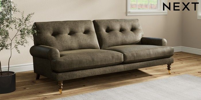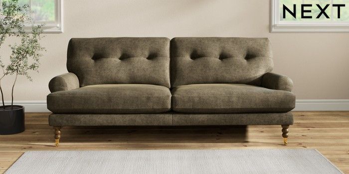 7.2.10 Erin Buttoned Back Deep Relaxed Sit 3 Seater Sofa Plush Chenille Moss Green High Classic Turned Brass Castor - Mid | Made Click here to use our website with more accessibility support, for example screen readers