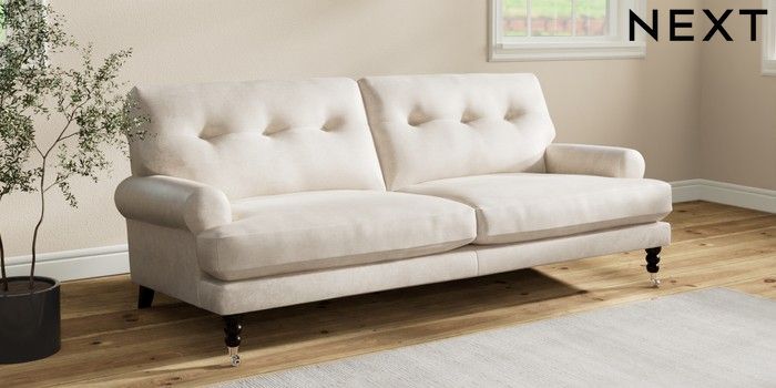 7.2.10 Erin Buttoned Back Deep Relaxed Sit 3 Seater Sofa Plush Chenille Oyster High Classic Turned Chrome Castor - Dark | Made Click here to use our website with more accessibility support, for example screen readers