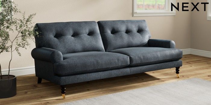 7.2.10 Erin Buttoned Back Deep Relaxed Sit 3 Seater Sofa Plush Chenille Slate Blue High Classic Turned Brass Castor - Dark | Made Click here to use our website with more accessibility support, for example screen readers