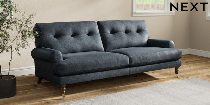 7.2.10 Erin Buttoned Back Deep Relaxed Sit 3 Seater Sofa Plush Chenille Slate Blue High Classic Turned Chrome Castor - Mid | Made Click here to use our website with more accessibility support, for example screen readers