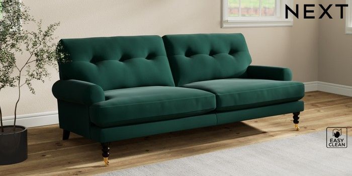 7.2.10 Erin Buttoned Back Deep Relaxed Sit 3 Seater Sofa Plush Velvet Easy Clean Bottle Green High Classic Turned Brass Castor - Dark | Made Click here to use our website with more accessibility support, for example screen readers
