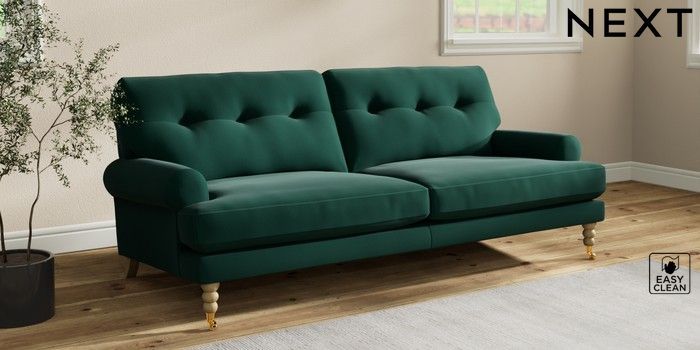 7.2.10 Erin Buttoned Back Deep Relaxed Sit 3 Seater Sofa Plush Velvet Easy Clean Bottle Green High Classic Turned Brass Castor - Light | Made Click here to use our website with more accessibility support, for example screen readers