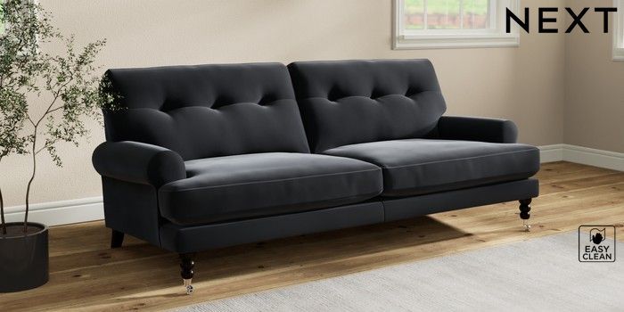 7.2.10 Erin Buttoned Back Deep Relaxed Sit 3 Seater Sofa Plush Velvet Easy Clean Charcoal Grey High Classic Turned Chrome Castor - Dark | Made Click here to use our website with more accessibility support, for example screen readers
