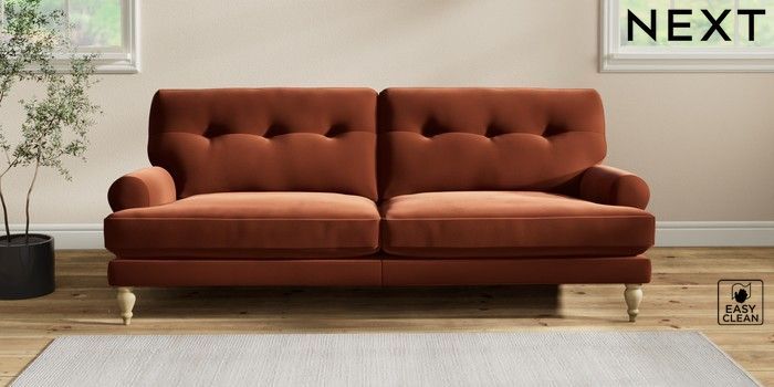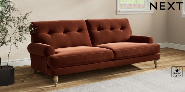 7.2.10 Erin Buttoned Back Deep Relaxed Sit 3 Seater Sofa Plush Velvet Easy Clean Ginger Orange High Classic Turned - Light | Made Click here to use our website with more accessibility support, for example screen readers
