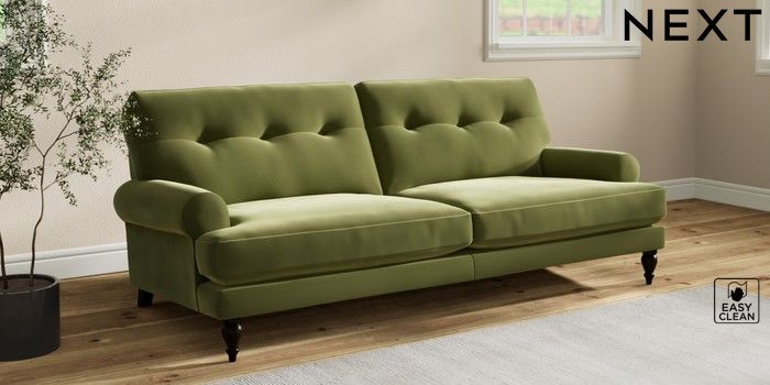 7.2.10 Erin Buttoned Back Deep Relaxed Sit 3 Seater Sofa Plush Velvet Easy Clean Mid Olive Green High Classic Turned - Dark | Made Click here to use our website with more accessibility support, for example screen readers