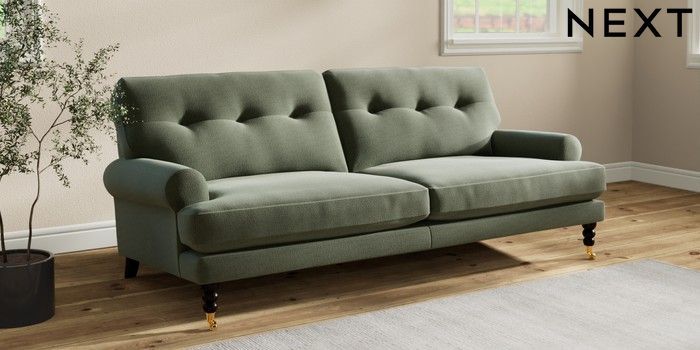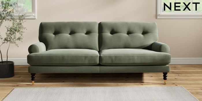 7.2.10 Erin Buttoned Back Deep Relaxed Sit 3 Seater Sofa Relaxed Linen Look Dark Green High Classic Turned Brass Castor - Dark | Made Click here to use our website with more accessibility support, for example screen readers