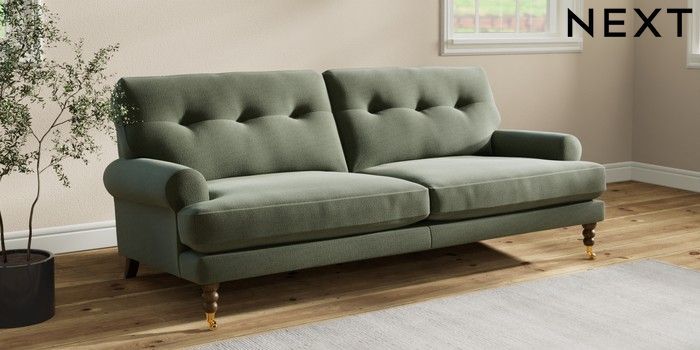 7.2.10 Erin Buttoned Back Deep Relaxed Sit 3 Seater Sofa Relaxed Linen Look Dark Green High Classic Turned Brass Castor - Mid | Made Click here to use our website with more accessibility support, for example screen readers