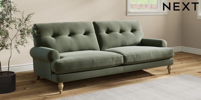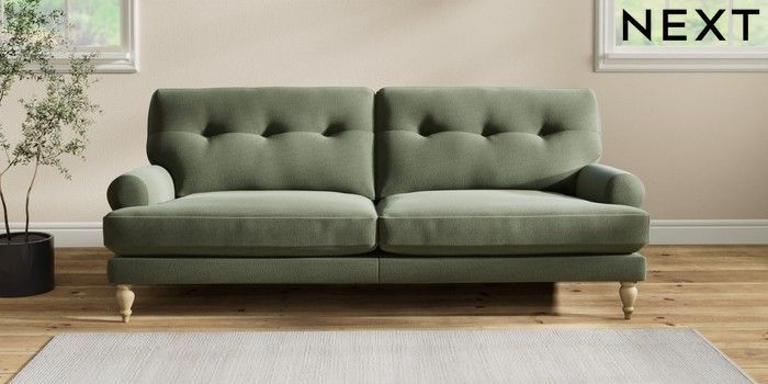7.2.10 Erin Buttoned Back Deep Relaxed Sit 3 Seater Sofa Relaxed Linen Look Dark Green High Classic Turned - Light | Made Click here to use our website with more accessibility support, for example screen readers