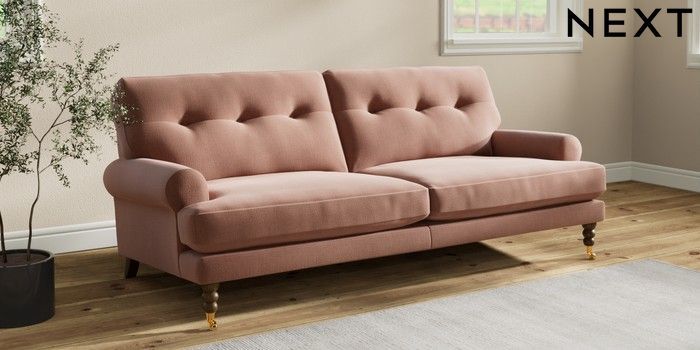 7.2.10 Erin Buttoned Back Deep Relaxed Sit 3 Seater Sofa Relaxed Linen Look Light Rust Brown High Classic Turned Brass Castor - Mid | Made Click here to use our website with more accessibility support, for example screen readers