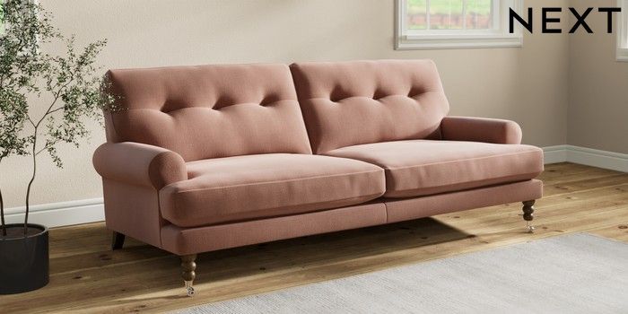 7.2.10 Erin Buttoned Back Deep Relaxed Sit 3 Seater Sofa Relaxed Linen Look Light Rust Brown High Classic Turned Chrome Castor - Mid | Made Click here to use our website with more accessibility support, for example screen readers