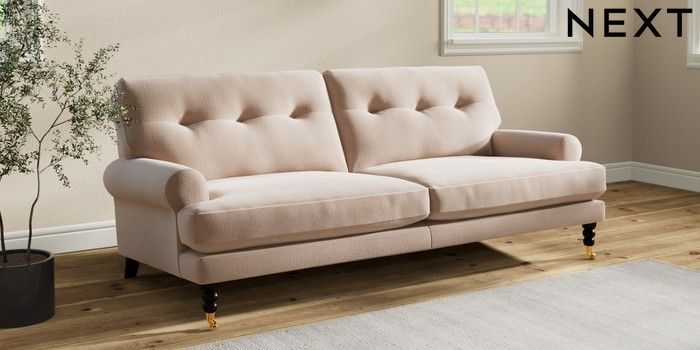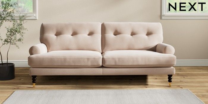7.2.10 Erin Buttoned Back Deep Relaxed Sit 3 Seater Sofa Relaxed Linen Look Mid Natural High Classic Turned Brass Castor - Dark | Made Click here to use our website with more accessibility support, for example screen readers