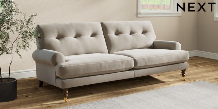 7.2.10 Erin Buttoned Back Deep Relaxed Sit 3 Seater Sofa Ripple Chenille Light Natural High Classic Turned Brass Castor - Mid | Made Click here to use our website with more accessibility support, for example screen readers