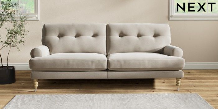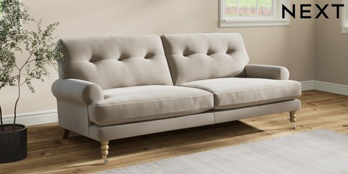 7.2.10 Erin Buttoned Back Deep Relaxed Sit 3 Seater Sofa Ripple Chenille Light Natural High Classic Turned Chrome Castor - Light | Made Click here to use our website with more accessibility support, for example screen readers