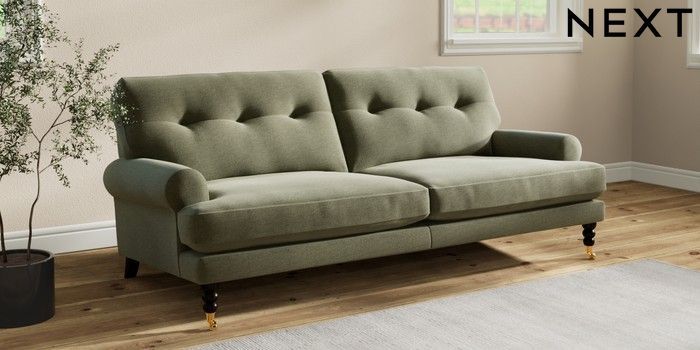 7.2.10 Erin Buttoned Back Deep Relaxed Sit 3 Seater Sofa Ripple Chenille Mid Moss Green High Classic Turned Brass Castor - Dark | Made Click here to use our website with more accessibility support, for example screen readers