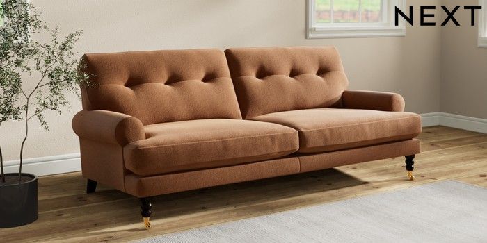 7.2.10 Erin Buttoned Back Deep Relaxed Sit 3 Seater Sofa Ripple Chenille Mid Rust Brown High Classic Turned Brass Castor - Dark | Made Click here to use our website with more accessibility support, for example screen readers