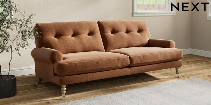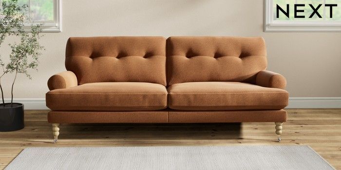 7.2.10 Erin Buttoned Back Deep Relaxed Sit 3 Seater Sofa Ripple Chenille Mid Rust Brown High Classic Turned Chrome Castor - Light | Made Click here to use our website with more accessibility support, for example screen readers
