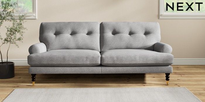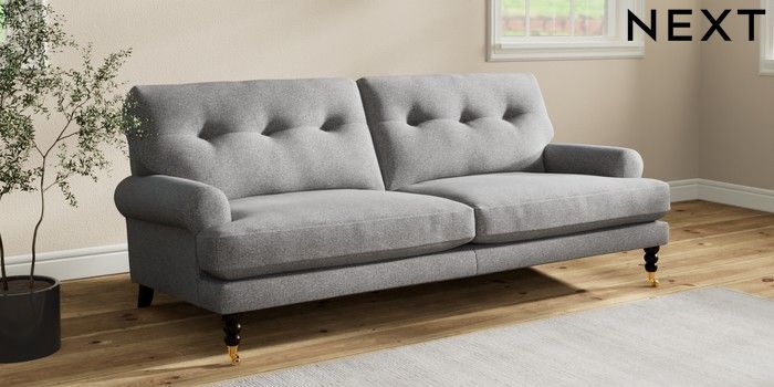 7.2.10 Erin Buttoned Back Deep Relaxed Sit 3 Seater Sofa Studio Chenille Mid Grey High Classic Turned Brass Castor - Dark | Made Click here to use our website with more accessibility support, for example screen readers
