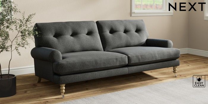 7.2.10 Erin Buttoned Back Deep Relaxed Sit 3 Seater Sofa Tweedy Blend Easy Clean Charcoal Grey High Classic Turned Chrome Castor - Light | Made Click here to use our website with more accessibility support, for example screen readers