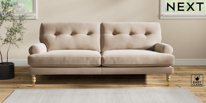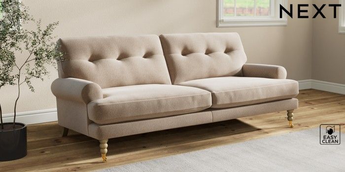 7.2.10 Erin Buttoned Back Deep Relaxed Sit 3 Seater Sofa Tweedy Blend Easy Clean Light Dove Natural High Classic Turned Brass Castor - Light | Made Click here to use our website with more accessibility support, for example screen readers