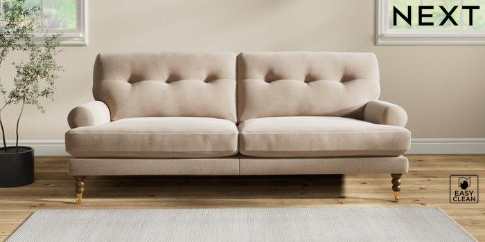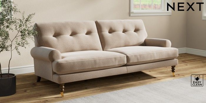 7.2.10 Erin Buttoned Back Deep Relaxed Sit 3 Seater Sofa Tweedy Blend Easy Clean Light Dove Natural High Classic Turned Brass Castor - Mid | Made Click here to use our website with more accessibility support, for example screen readers
