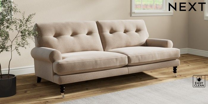 7.2.10 Erin Buttoned Back Deep Relaxed Sit 3 Seater Sofa Tweedy Blend Easy Clean Light Dove Natural High Classic Turned Chrome Castor - Dark | Made Click here to use our website with more accessibility support, for example screen readers