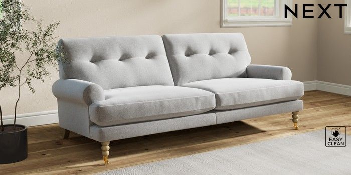 7.2.10 Erin Buttoned Back Deep Relaxed Sit 3 Seater Sofa Tweedy Blend Easy Clean Light Silver Grey High Classic Turned Brass Castor - Light | Made Click here to use our website with more accessibility support, for example screen readers