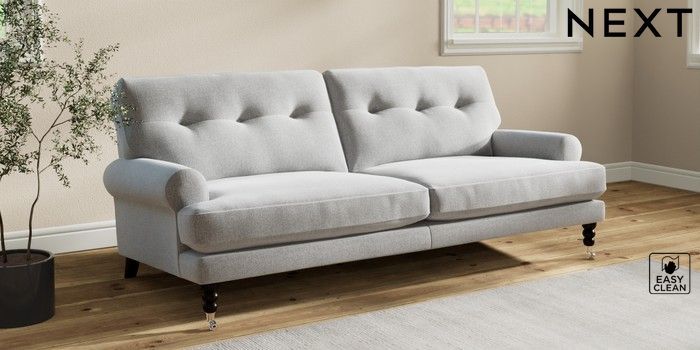 7.2.10 Erin Buttoned Back Deep Relaxed Sit 3 Seater Sofa Tweedy Blend Easy Clean Light Silver Grey High Classic Turned Chrome Castor - Dark | Made Click here to use our website with more accessibility support, for example screen readers
