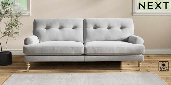 7.2.10 Erin Buttoned Back Deep Relaxed Sit 3 Seater Sofa Tweedy Blend Easy Clean Light Silver Grey High Classic Turned Chrome Castor - Light | Made Click here to use our website with more accessibility support, for example screen readers