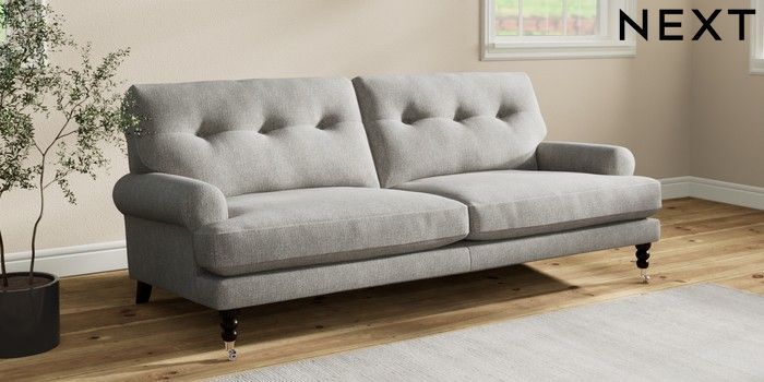 7.2.10 Erin Buttoned Back Deep Relaxed Sit 3 Seater Sofa Tweedy Chenille Mid Grey High Classic Turned Chrome Castor - Dark | Made Click here to use our website with more accessibility support, for example screen readers