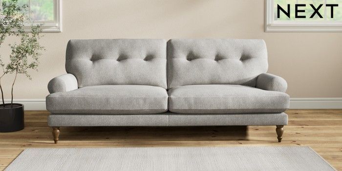 7.2.10 Erin Buttoned Back Deep Relaxed Sit 3 Seater Sofa Tweedy Chenille Mid Grey High Classic Turned - Mid | Made Click here to use our website with more accessibility support, for example screen readers
