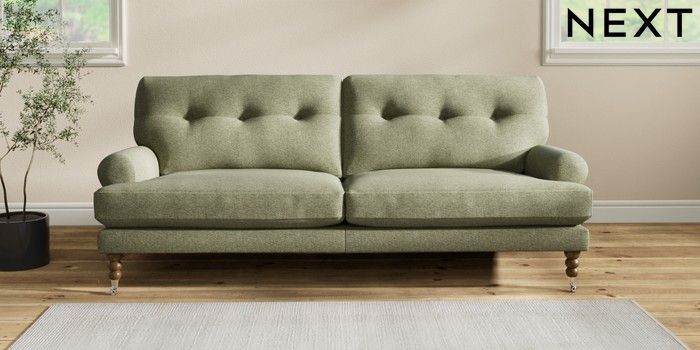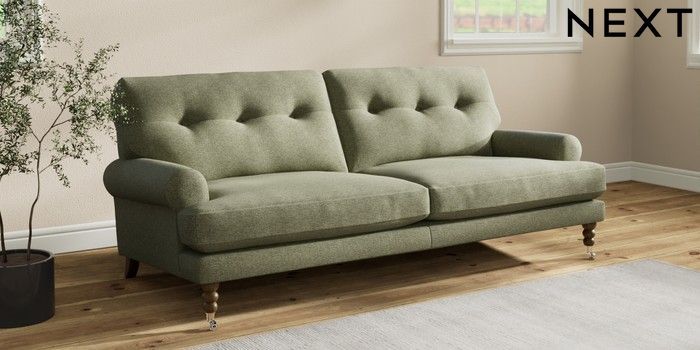 7.2.10 Erin Buttoned Back Deep Relaxed Sit 3 Seater Sofa Tweedy Chenille Mid Moss Green High Classic Turned Chrome Castor - Mid | Made Click here to use our website with more accessibility support, for example screen readers