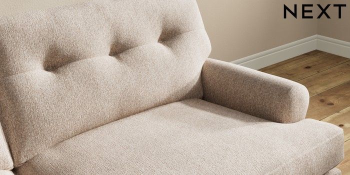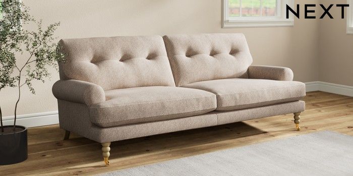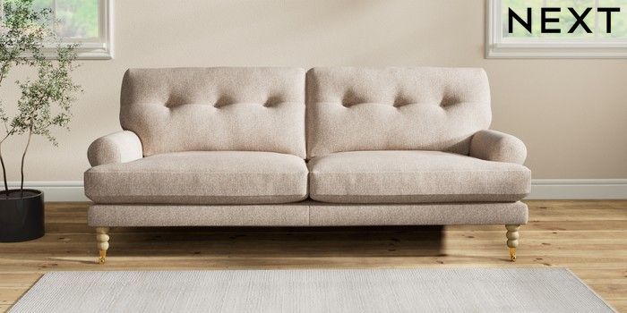 7.2.10 Erin Buttoned Back Deep Relaxed Sit 3 Seater Sofa Tweedy Chenille Mid Natural High Classic Turned Brass Castor - Light | Made Click here to use our website with more accessibility support, for example screen readers