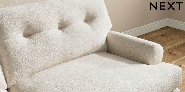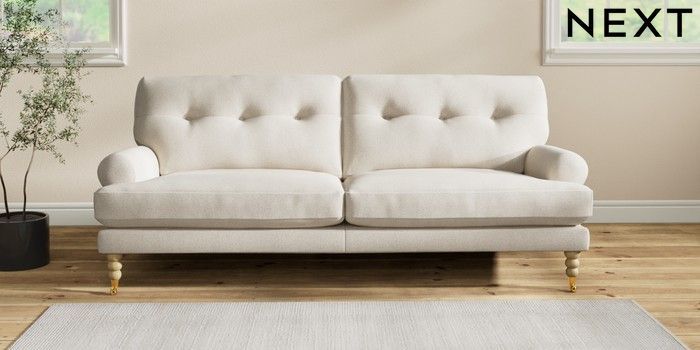 7.2.10 Erin Buttoned Back Deep Relaxed Sit 3 Seater Sofa Tweedy Chenille Oyster High Classic Turned Brass Castor - Light | Made Click here to use our website with more accessibility support, for example screen readers