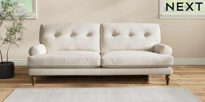 7.2.10 Erin Buttoned Back Deep Relaxed Sit 3 Seater Sofa Tweedy Chenille Oyster High Classic Turned - Mid | Made Click here to use our website with more accessibility support, for example screen readers