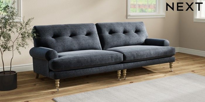 7.2.10 Erin Buttoned Back Deep Relaxed Sit 4 Seater Large Sofa Boucle Chenille Dark Slate Blue High Classic Turned Chrome Castor - Light | Made Click here to use our website with more accessibility support, for example screen readers