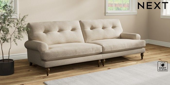 7.2.10 Erin Buttoned Back Deep Relaxed Sit 4 Seater Large Sofa Boucle Weave Easy Clean Dark Natural High Classic Turned - Mid | Made Click here to use our website with more accessibility support, for example screen readers